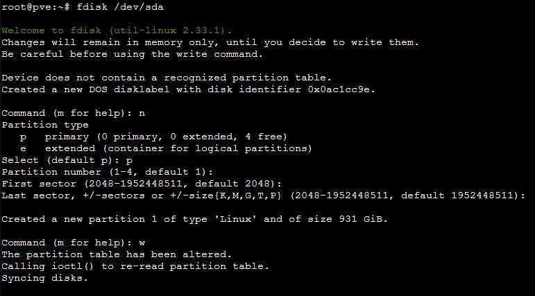 Die neue Festplatte dürfte keine Partition haben und sollte daher leicht zu erkennen sein. Wenn wir unsere neue Festplatte ausgemacht haben, erstellen wir mit fdisk eine neue Partition. Dazu benutzen wir den Befehl