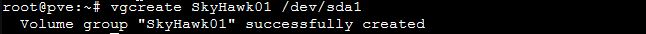 Damit erstellen wir eine neue „Volume Group“ mit dem Namen „SkyHawk01“ und unserem „Physical Volume“ „/dev/sda1“.