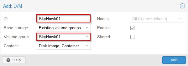 Wir vergeben in dem sich öffnenden Fenster eine ID (einen Namen, unter dem wir die Festplatte nun in der Weboberfläche nutzen werden) und ordnen die neue Volume Group „SkyHawk01“ zu.