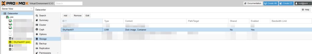 Haben wir auch diesen Schritt abgeschlossen, können wir die neue Festplatte verwenden. Dazu schließen wir die Shell und gehen in die Weboberfläche. Hier fügen wir unserem „Datacenter“ unter dem Punkt „Storage“ die neue Festplatte als „LVM“ hinzu.