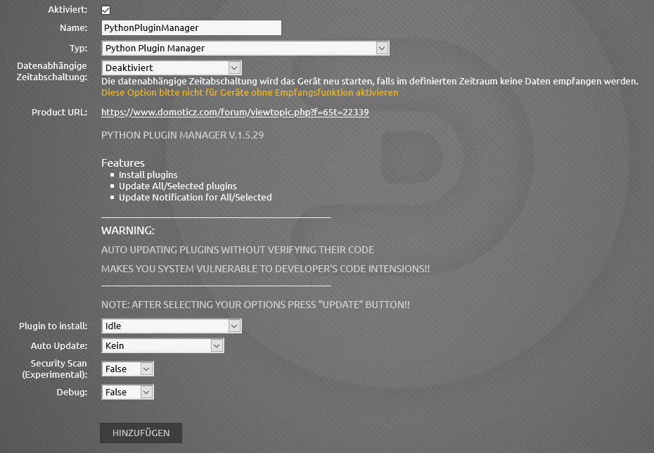 Nach der Installation kann der Plugin Manager im Domoticz Hardware Tab hinzugefügt werden:
