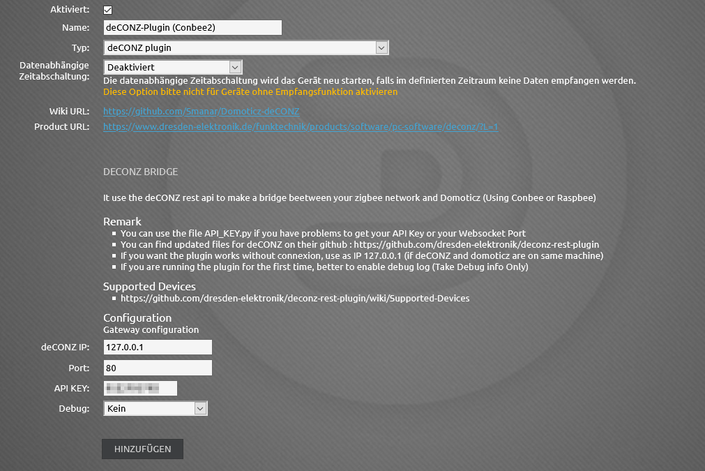 Anschließend kann im Domoticz Hardware Tab das deCONZ Plugin hinzugefügt werden.
